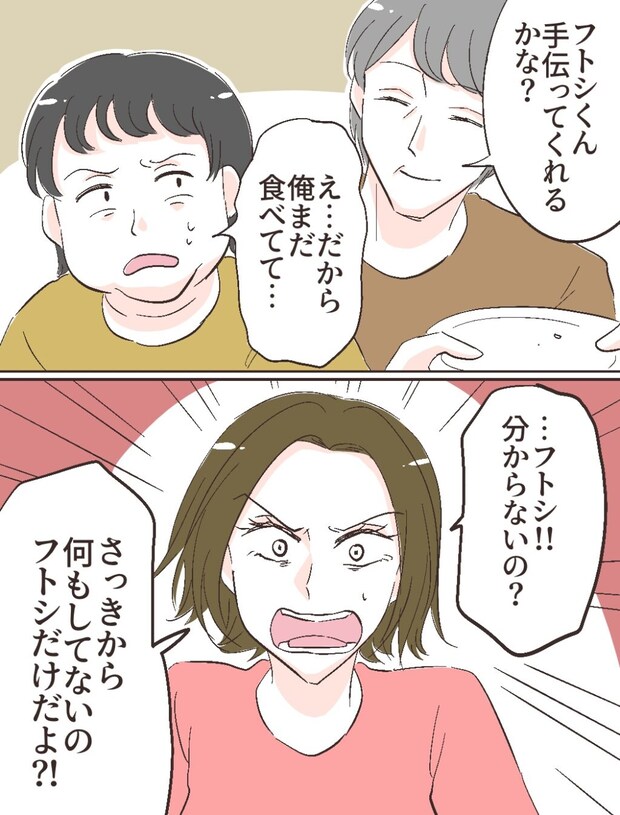 そして、「フトシくん、手伝ってくれるかな?」と優しくたずねると、「え・・だから、俺まだ食べてて・・」とこ言うフトシに、「・・フトシ!!分からないの?さっきから何もしてないのフトシだけだよ!?」と大きな声でそう言うと、