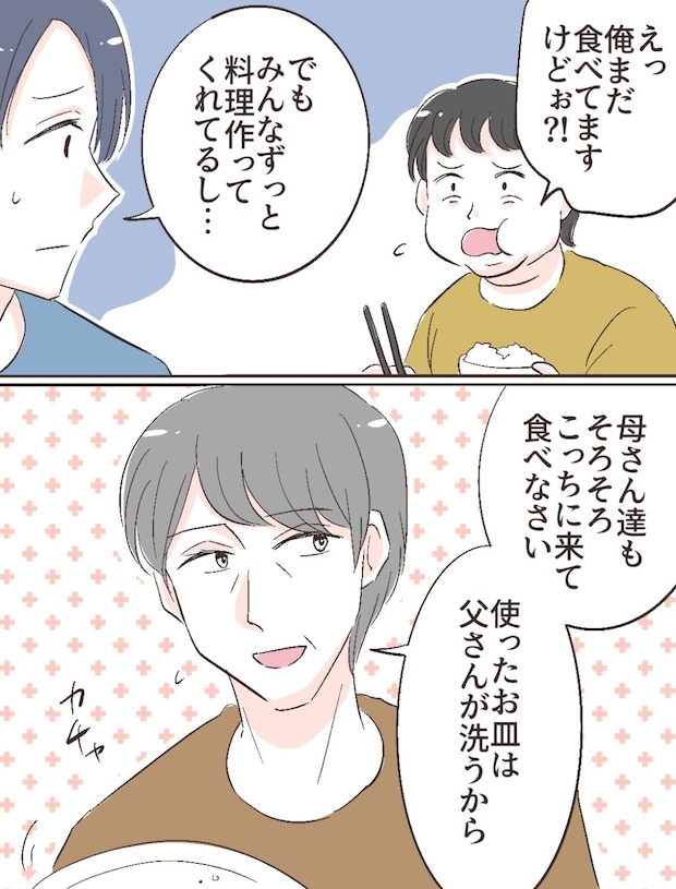 「えっ、俺まだ食べてますけどぉ!?」不満そうに言うフトシ。「でも、みんなずっと料理作ってくれてるし・・」と言われているのが気になって仕方がありません。すると、「母さん達もそろそろこっちに来て食べなさい。使ったお皿は父さんが洗うから」とさわやかに登場したのはお父さんでした。