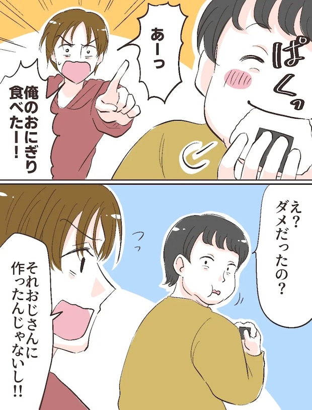 「ぱくっ!」とおにぎりを食べました。それを見たショウヘイくんが、「あーっ、俺のおにぎり食べた!!」と大きな声を出すも、「え?ダメだったの?」と驚きもせずに振り返るフトシ。すると、「それおじさんに作ったんじゃないし!!」とショウヘイくんが反論しました。