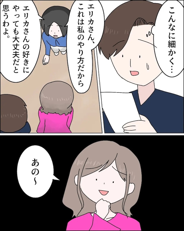 リナさんの説明を聞きながら「こんなに細かく・・」と想像以上のリナさんの仕事内容に驚くケイさん。リナさんが「エリカさん、これは私のやり方だから、エリカさんの好きにやっても大丈夫だと思うわよ」とエリカさんに言うと、エリカさんは薄笑いを浮かべながら「あの~」と切り出しました。
