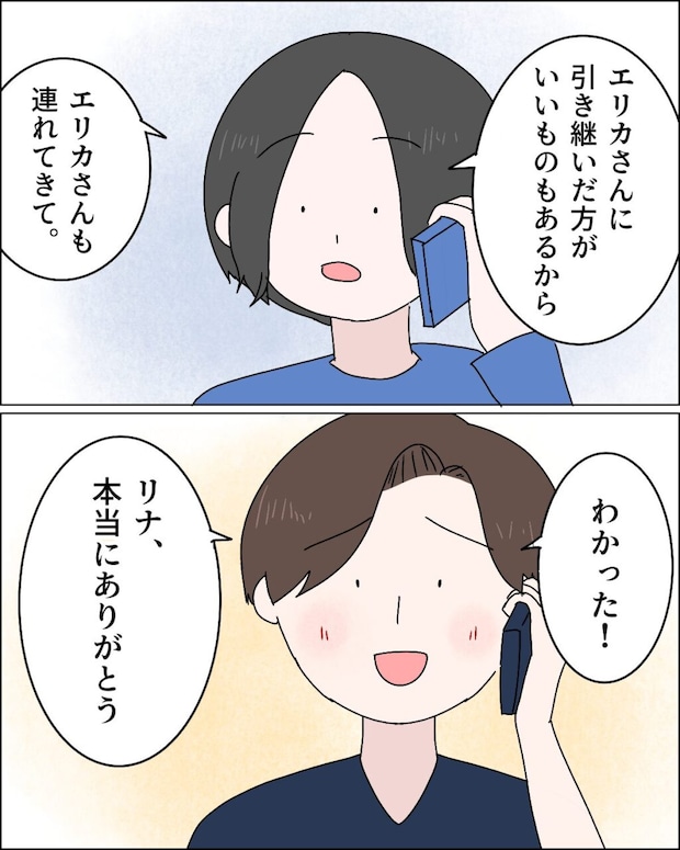 「エリカさんに引き継いだ方がいいものもあるから、エリカさんも連れてきて」とリナさんが言うと、「わかった!リナ、本当にありがとう」とケイさんは感謝します。