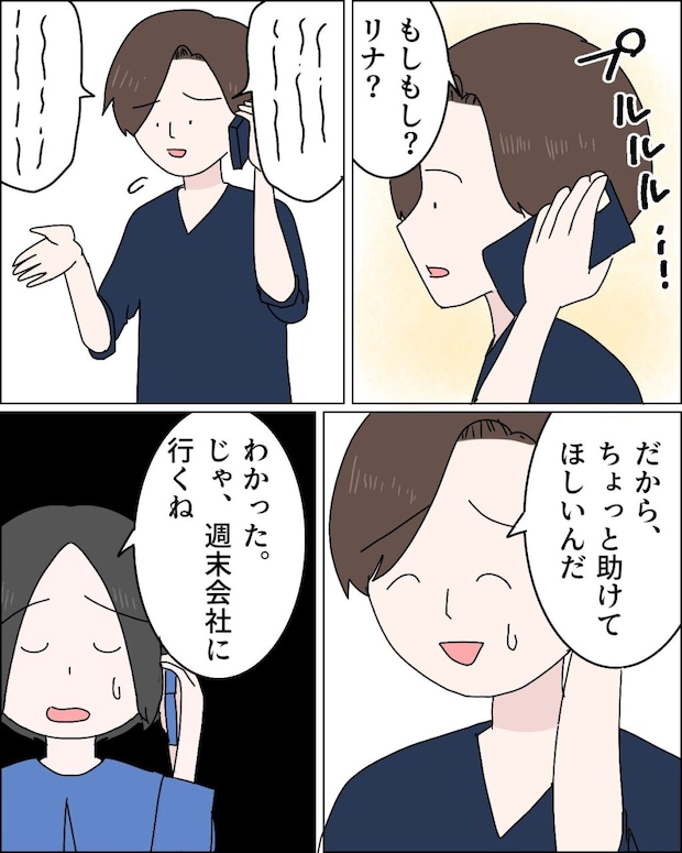 エリカさんの提案を受け、ケイさんはさっそくリナさんに電話をして事情を説明。「だから、ちょっと助けてほしいんだ」とケイさんに頼まれたリナさんは「わかった。じゃ、週末会社に行くね」と渋々了承。