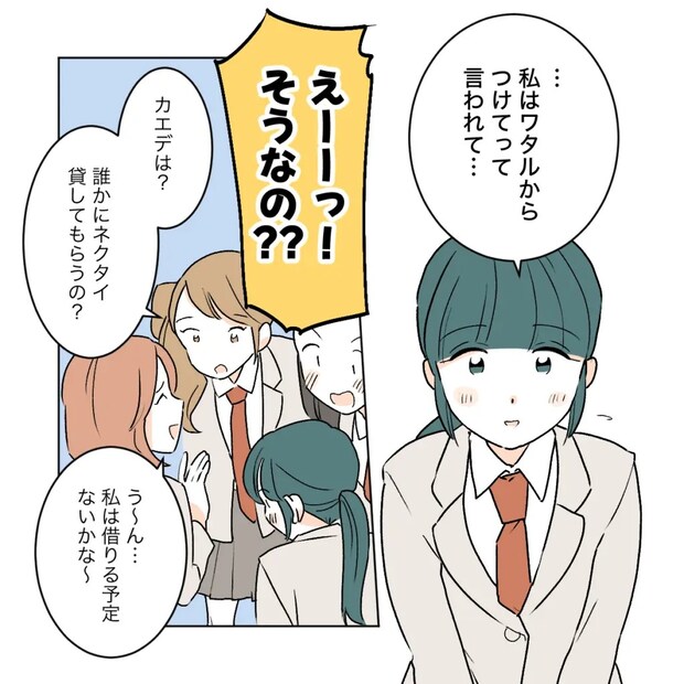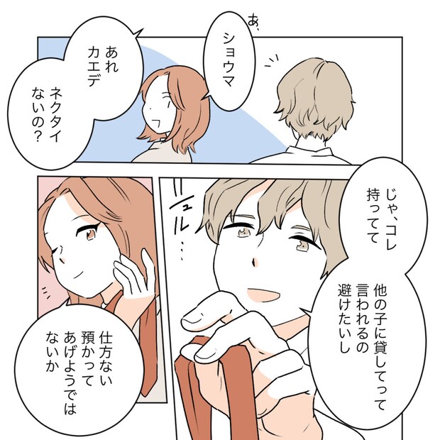 「あれカエデ。ネクタイないの?」とショウマがやってきました。「じゃ、これ持ってて。他の子に貸してって言われるの避けたいし」と言ってショウマは自分のネクタイをカエデに差し出しました。「仕方ない、預かってあげようではないか」とおどけるカエデ。