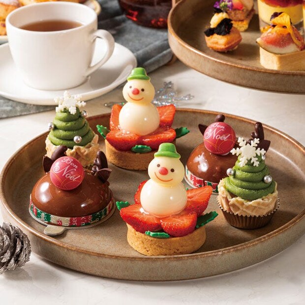 2段目では、自家製カスタードクリームの上に国産いちごをのせ、チーズムースで作った雪だるまが飾られた「チーズムースの雪だるまタルト」や、抹茶の和風モンブランに仕上げられた「クリスマスツリー ~大納言小豆と抹茶~」、チョコレートムースでトナカイをイメージした「赤鼻のトナカイ ~オレンジ風味のチョコレートムース~」を楽しんで。