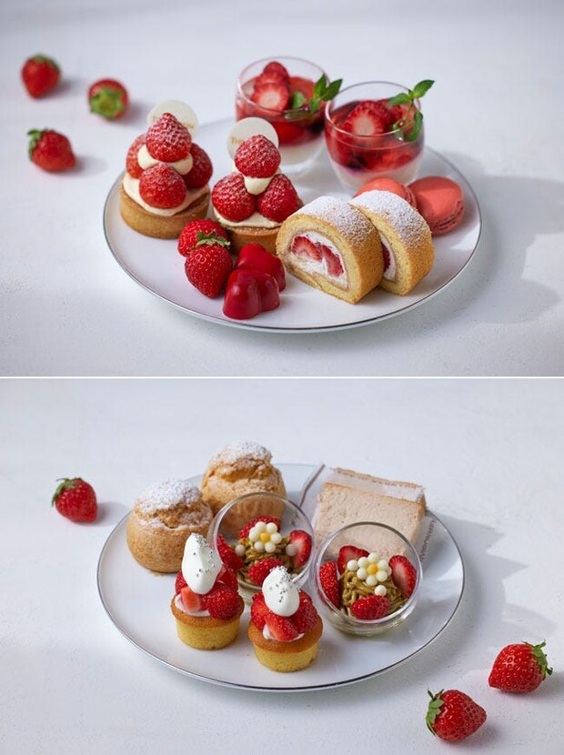 週末限定で登場するのは、旬のいちごを存分に堪能できる「ストロベリー アフタヌーンティー」。上段と中段には9種類の多彩ないちごスイーツがぎっしりと並び、いちご好きにはたまらない光景が広がる。