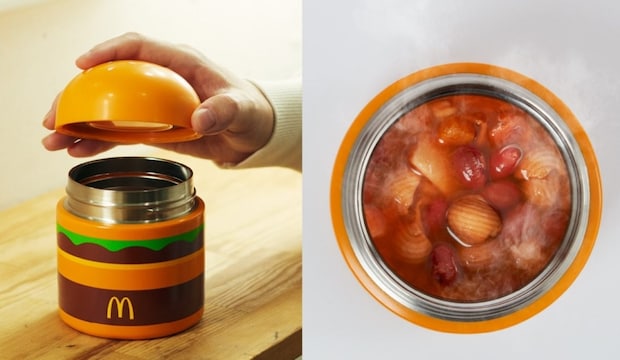 定番商品「ビッグマック」の見た目を再現したスープジャー。ユニークな見た目だけでなく、保温・保冷が可能で、機能性も兼ね備えている。内容量は約300ml。大きさは幅9cm×奥行9cm×高さ11.4cm。