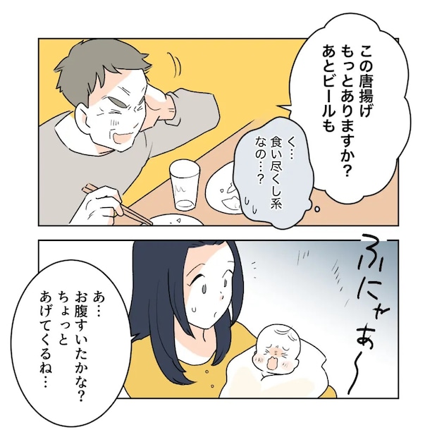 お七夜当日、マミさんの嫌な予感は見事に的中しました。義父は自分勝手な行動を連発し、もはや誰が主役なのか分からないほどです。1時間も遅れて来たにもかかわらず、遅刻を詫びる気配もなく、初めて会う孫に声をかけることすらせず、席に着くなり料理を食べ始めます。それだけに留まらず「この唐揚げもっとありますか?あとビールも」と、遠慮ゼロの要求を繰り返す始末。マミさんたちはその図々しい姿にドン引きしますが、当の本人は周囲の空気にまったく気付かないままでした。嫁側の家に招かれているのに、ここまで図々しい行動ができるのは逆にあっぱれですよね。
