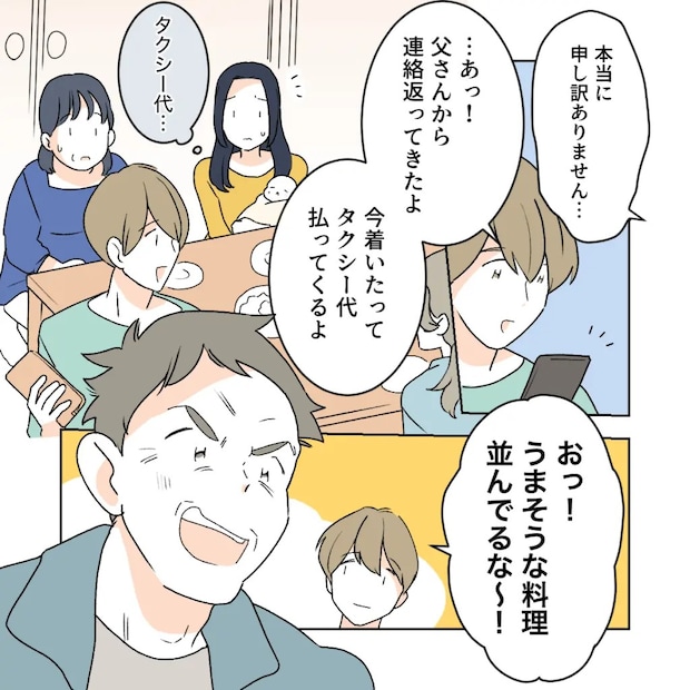 お七夜を始めようとしたその時、ショウタが「父さん今着いたって、タクシー代払ってくるよ」と席を立ちました。私は「ショウタが払う必要なんてないのに」と思いながらも、義父を迎えに行く彼の背中を見送ります。ほどなくして義父が到着・・・しかし、遅刻を詫びることも、初めて会う孫に声をかけることもなく「おっ!うまそうな料理並んでるな~!」と言い、ずかずかと腰を下ろしました。