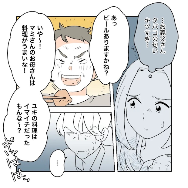 沖縄で結婚式を挙げる予定のマミさんとショウタさん。二人とも両親が離婚しており、マミさんは母親と姉、ショウタさんは母親と妹だけを式に招待し、お互い父親は呼ばないことに決めていました。しかし、父方の祖母から「父親が祝いたいと言っている」と聞いたショウタさんは、意を決して会うことに。実際に会ってみてびっくり、初対面にも関わらずデリカシーも遠慮もない姿にマミさんはドン引きします。一方のショウタさんは久々の再会で嬉しくなったのか舞い上がり、お金がないと言う義父の交通費とホテル代まで負担して、独断で結婚式に招待してしまいます。義父に肩入れするあまり、周りが見えなくなっているショウタさんを心配したマミさんは、「気にかけすぎじゃない?」と声を掛けますが、「お金がない人は子どもを祝っちゃいけないの?」と聞く耳を持ちません。結局、結婚式はその空気を引きずり、気まずさを感じるものとなってしまいました。それから2年、マミさんは男の子を出産しました。するとショウタさんは、義父をお七夜に呼びたいと言い出します。本音を言えば会いたくないマミさんでしたが、ショウタさんの気持ちを考えると強くは断れず、結局義父もお七夜に参加することになってしまったのです。