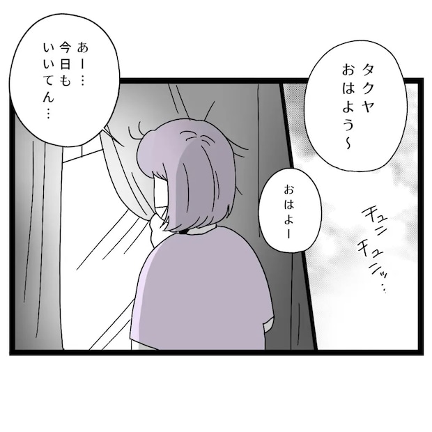 「タクヤおはよう~」「おはよー」と挨拶しながら、「あー・・今日もいいてん・・」とカーテンを開けた私。