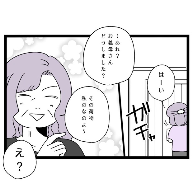 「はーい」また何か届いたのかと思いドアを開けると義母が。「・・あれ?お義母さんどうしました?」とたずねると、「その荷物私のなのよ~」と笑顔で言い、「え?」と驚く私。「だって私の名前なのに・・」