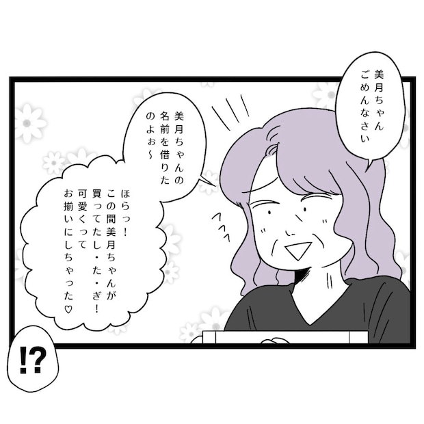 すると、「美月ちゃんごめんなさい。美月ちゃんの名前を借りたのよぉ~。ほらっ!この間美月ちゃんが買ってたし・た・ぎ!可愛くってお揃いにしちゃった」と義母に嬉しそうに言われ、意味がわかりませんでした。