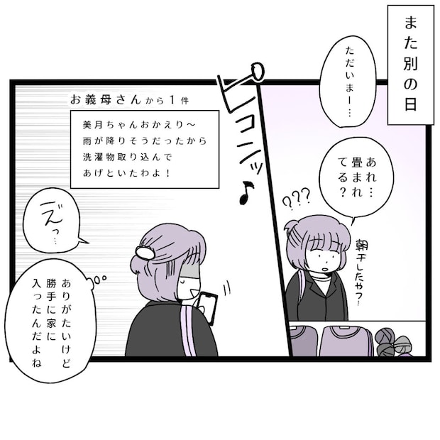 「ただいまー・・あれ・・畳まれてる?」仕事から帰ると、朝干した洗濯物が畳んで置いてあり、不思議に思っていると、「美月ちゃんおかえり~。雨が降りそうだったから洗濯物取り込んであげといたわよ!」義母からのメッセージに「え゛っ・・ありがたいけど勝手に家に入ったんだよね」とドン引きしてしまいました。