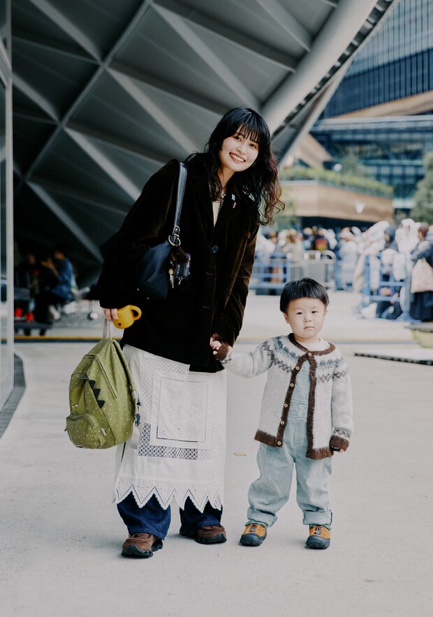 mom’s item>>>merci campaのジャケット、ユーズドのニットカーディガン、ロンハーマンのラップスカート、ユニクロのデニム、folnuaのバッグ