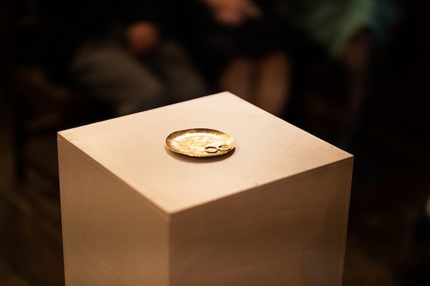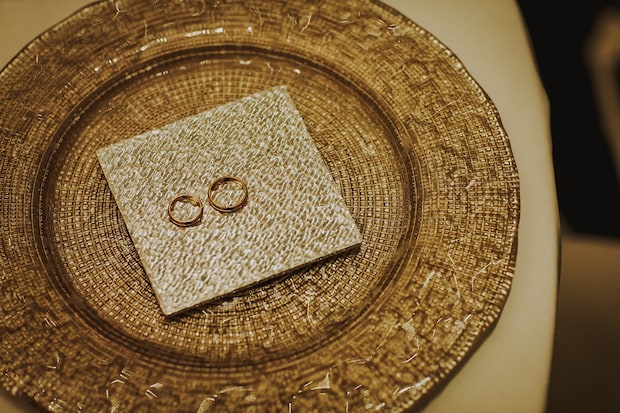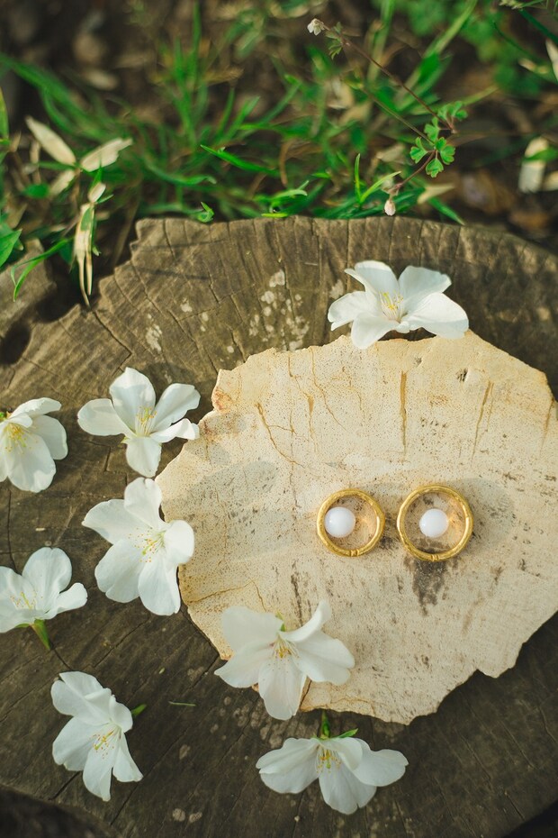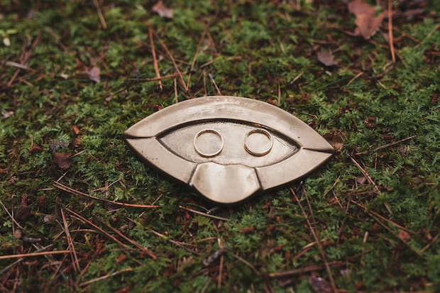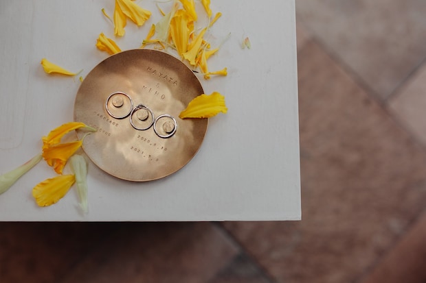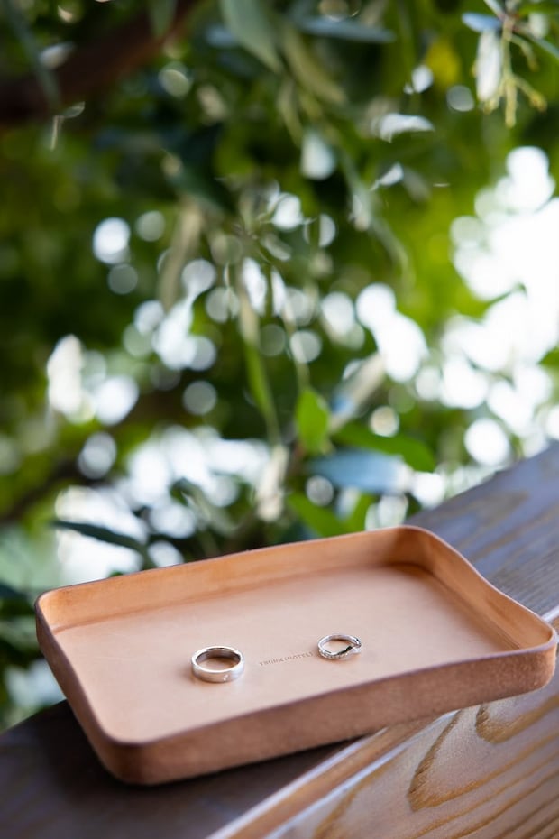 ヴィンテージの真鍮トレイを、そのままシンプルにリングピローとして使用した花嫁さん。
