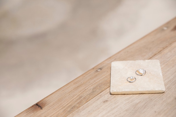 こちらはウッドにも石にも見える素材のプレートを使ったリングピロー。