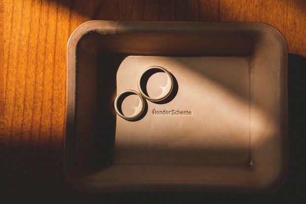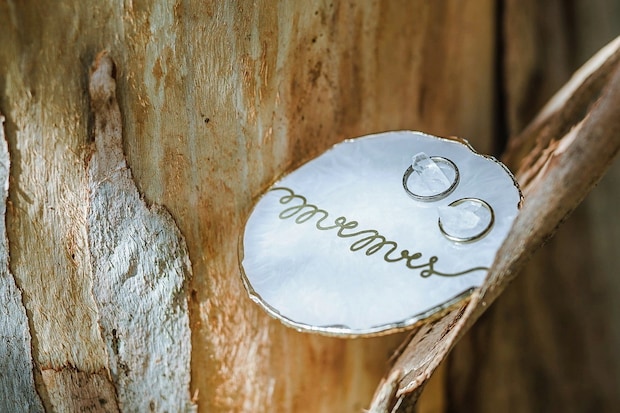 家具職人の新郎が手作りしたカッティングボードをリングピローに