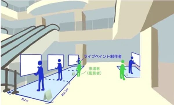同イベントの目玉は、縦90cm×横180cmの巨大パネル3面+1面のパネルを組み合わせた合計4面、総計7.2mにも及ぶライブペイント。