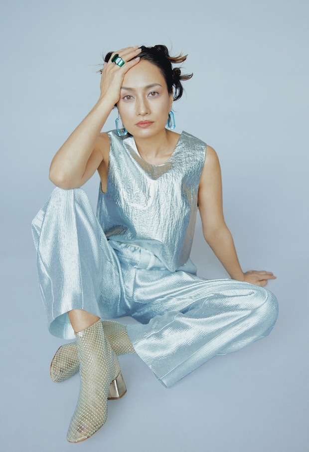 トップス¥17,600(イウエン マトフ/ユナイテッドアローズ 渋谷スクランブルスクエア店)、パンツ¥26,400(アストラット/アストラット 新宿店)、ピアス¥49,500、リング¥44,000(共にスワロフスキー・ジュエリー/スワロフスキー・ジャパン)、シューズ¥121,000(フォルテ フォルテ/コロネット)