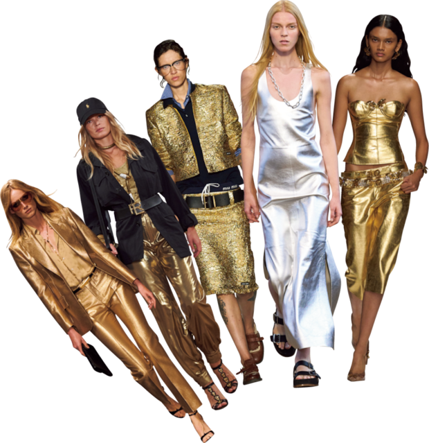 やっぱり気になるキラキラアイテム。今季はラメやスパンコールというより、“箔”な質感のギラッとした輝き。小物でポイント使いするだけでなく、思いきってトップやボトムも着たい。Tシャツなどと合わせればトライしやすそう。