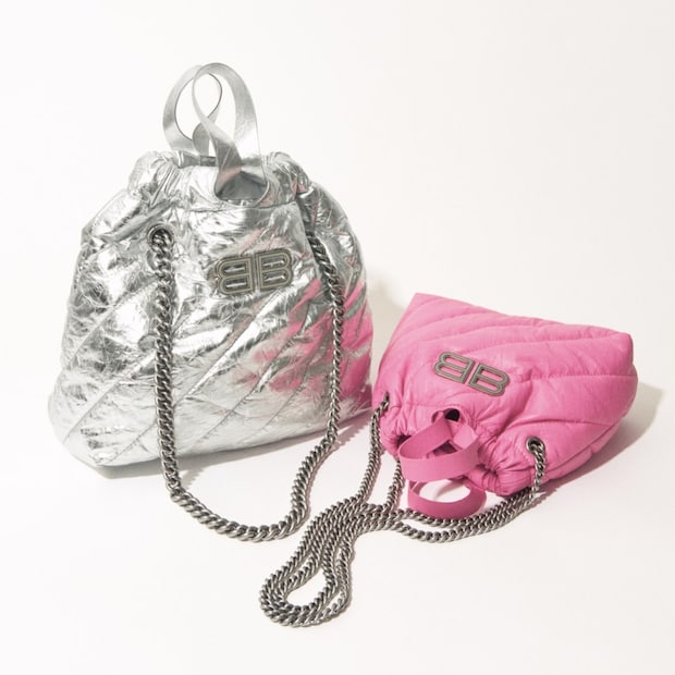 シルバーのバッグ〈クラッシュ〉[H30×W27×D10㎝]¥346,500、ピンクのバッグ〈クラッシュ〉[H20×W20×D8㎝]¥287,100(共にバレンシアガ/バレンシアガ クライアントサービス)