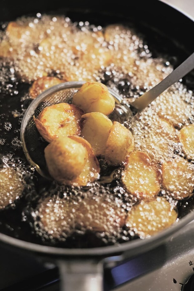 じゃがいもはフチがこんがりと色づくまで揚げて。レンジで加熱してから揚げると、水分が抜けやすくなって短時間で揚がり、カリッと仕上がる。