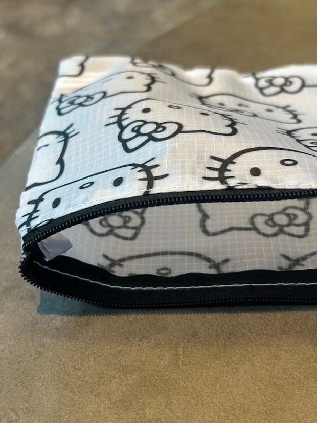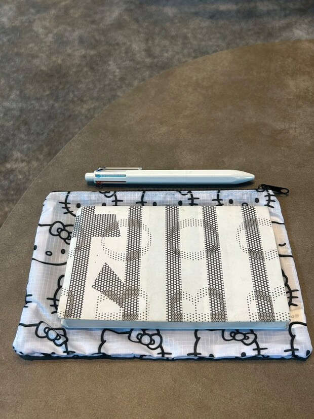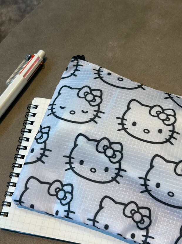 表情の異なるハローキティの総柄です。ノートやペン、ガジェットまで、こまごまとした小物をまとめて。