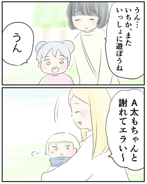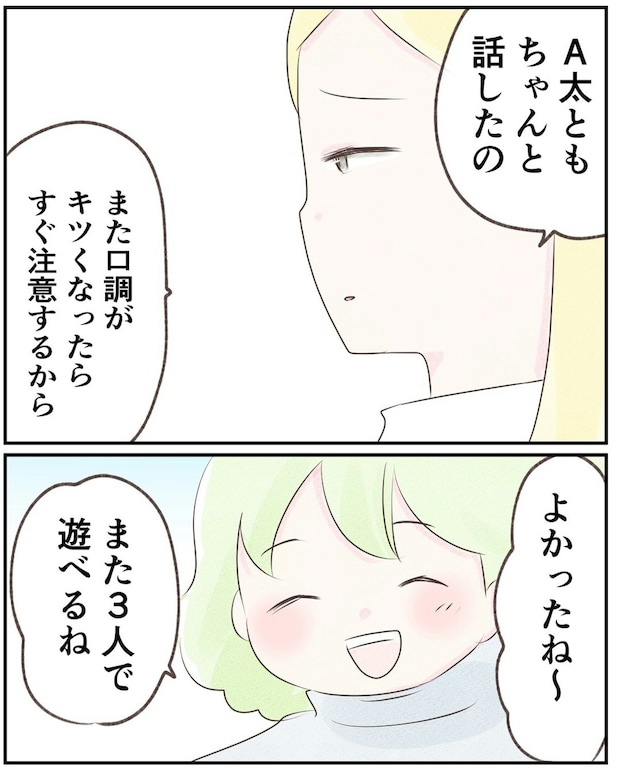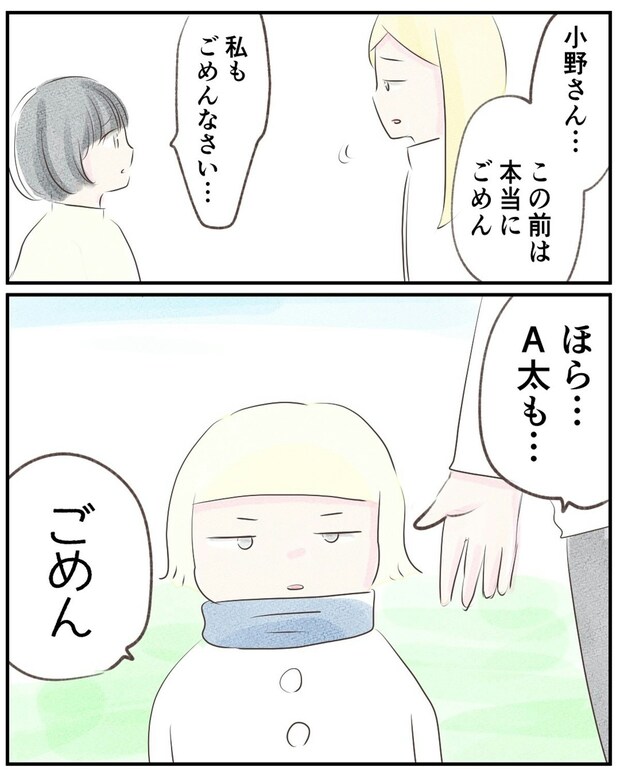 平田さんの家で話していた時は、もう小野さんと仲良くしないのかと思えるような怒りっぷりでしたが、相川さんから謝ってきました。時間がたって、やはりA太が嚙んだことはよくないと思い直してくれたのでしょうか。