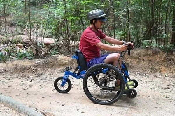 「マウンテントライク」は、英国で開発された、全地形対応型のアウトドア用車いす。最大の特徴は、泥やぬかるみで手が汚れないよう、手元のレバーを漕いで進む独自の駆動システムと、3輪それぞれに搭載された独立型サスペンションだ。これにより、森の中のトレイルや砂利道といった「でこぼこの道」でも、安定した滑らかな乗り心地を実現する。