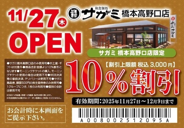 「和食麺処サガミ橋本高野口店」のオープンを記念し、3週連続で「OPEN祭り」を開催する。