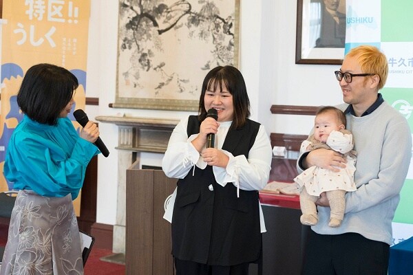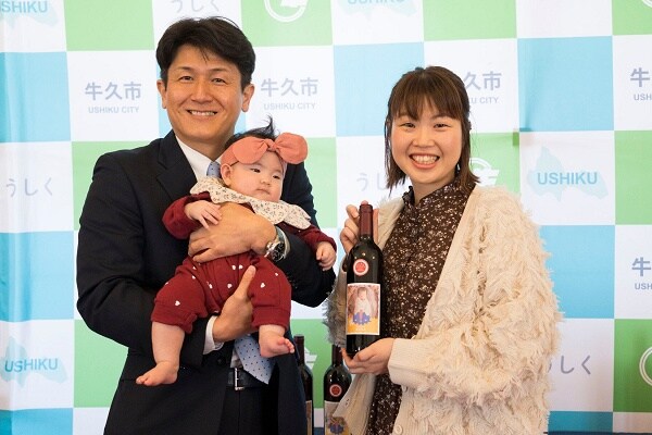 式に参加した市内在住の塚本さんは、「記念となるボトルでとてもうれしいです」と笑顔を見せたそう。また、移住のきっかけを尋ねられた互さんは、「結婚を機に引っ越してきたのですが、自然も多く落ち着いた環境の中で子育てができると思って牛久を選びました」と、牛久市の魅力を語った。