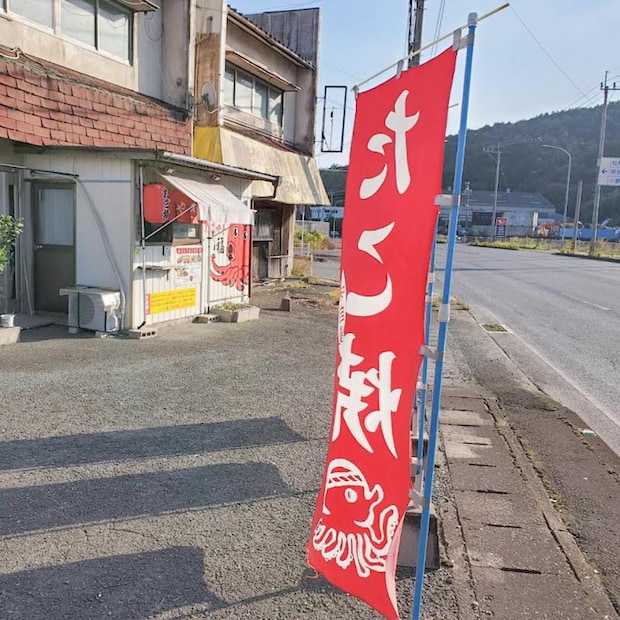 「たこ焼き」「焼きそば」などと書かれたのぼりと、ユーモラスなたこのイラストが書かれた販売ブースが目印。