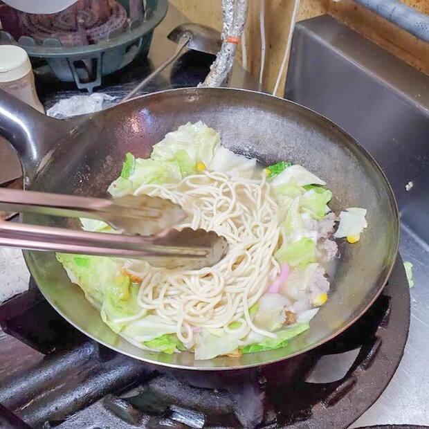 同時進行で、しゃきしゃきの野菜がてんこ盛りで美味しいと評判のちゃんぽんも、手慣れた手つきで仕上げていきます。
