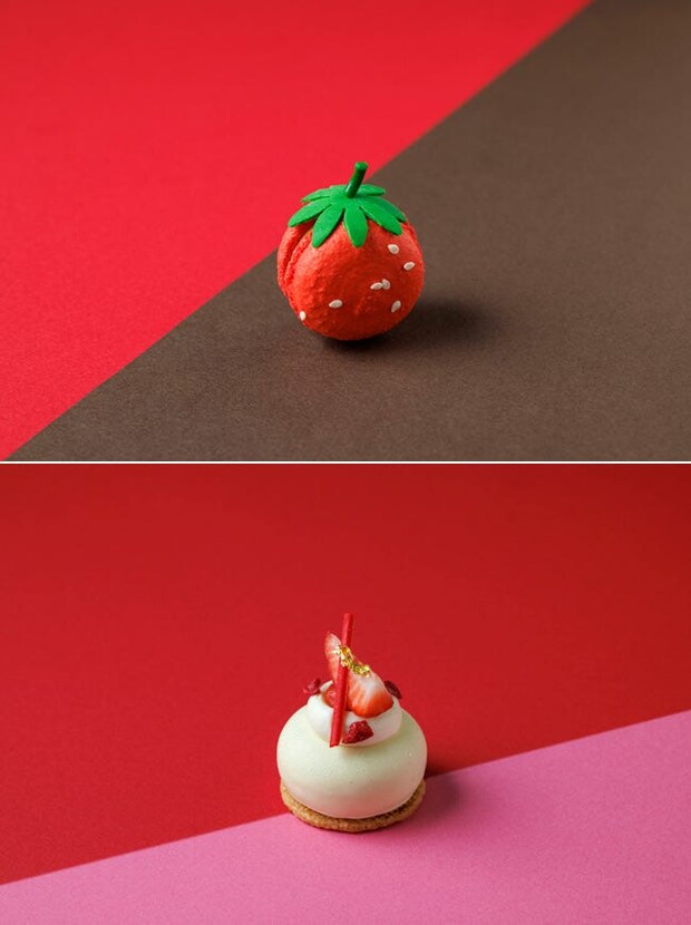 スイーツは、いちごの甘酸っぱさとチョコレートの深みが楽しめる、この季節だけの贅沢なラインナップでお届け。グリーンのチョコレートでいちごの形に仕上げられた「苺とピスタチオのマカロン」は、白ごまを散らしたレッドマカロンの中に、ピスタチオとホワイトチョコレートのガナッシュ、そしてフレッシュないちごのジュレが忍ばせられている。