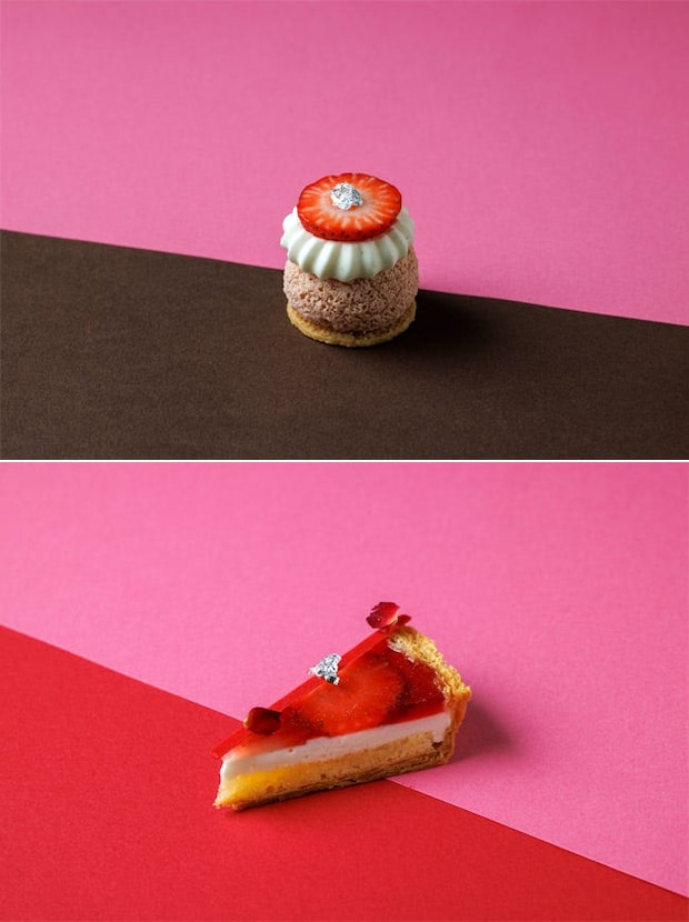 ローズの香るスポンジとホワイトチョコレートクリーム、いちごのジュレが重ねられた「苺とローズのタルト」は、バラの花びらとヴァローナ ストロベリーチョコレートで仕上げられている。繊細でロマンティックな余韻の広がりを感じて。