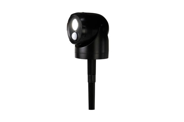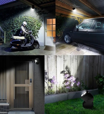 暗闇の中、高感度センサー(人感センサー&明暗センサー)によって人や動物などの動きを検知すると、想像以上に強烈な光のスポットライトが自動点灯し、夜間の防犯につながるという。