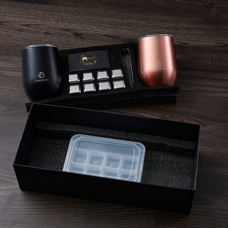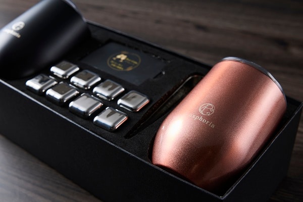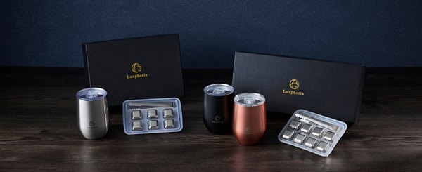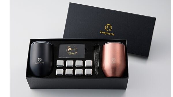 Luxphoriaのギフトボックスに、ステンレス二重構造のタンブラー2色(各360ml)、ステンレス製のトング、ビアキューブ透明保管ケース、ブランドカードをセット。
