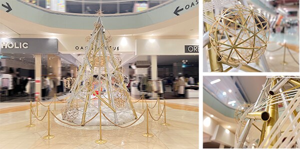 竹ツリーは、竹の直線と竹筋のアーチを生かし、オーナメントにはこのツリーのために制作された竹ボールを使用。温かみと静けさを感じる存在感のあるツリーに仕上げられている。さらに、素材の背景や再利用の意義を伝える説明パネルも併設。来館者に考えるきっかけを与える仕掛けが盛り込まれている。