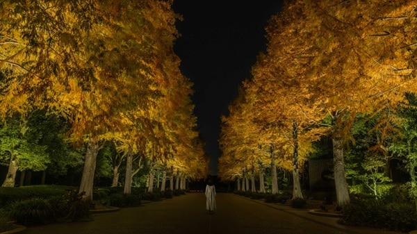 チームラボによる大阪府大阪市「長居植物園」の夜の野外ミュージアム「チームラボ ボタニカルガーデン 大阪」も紅葉の見頃を迎え、複数の作品が秋の景色に変化している。