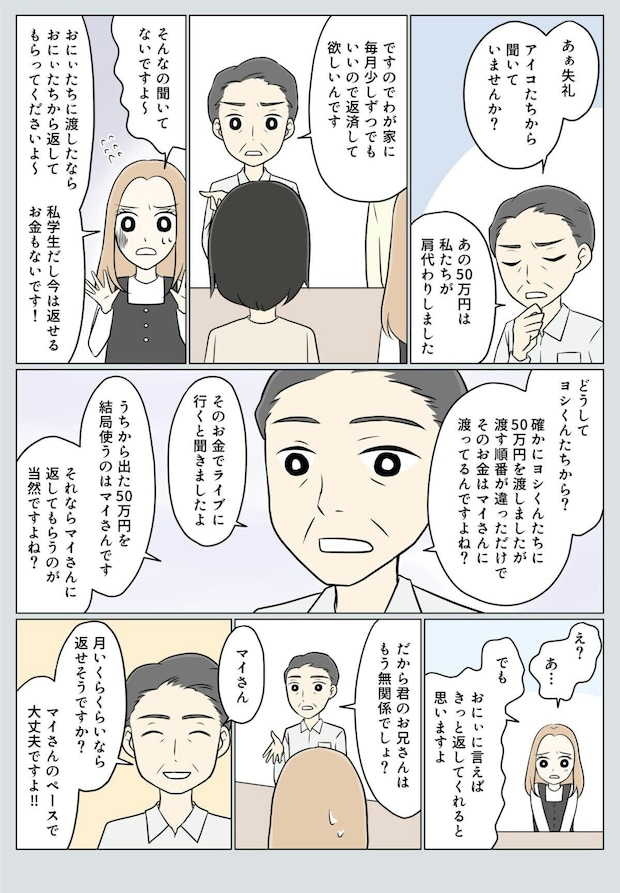 そして、アイコの両親・義母・マイの4人で話す機会が設けられました。50万円は自分たちが肩代わりしたという両親に対し、マイはあくまでも返済は兄であるヨシがすると繰り返します。しかし、お金を使っているマイに返済義務があると冷静に話をするアイコの父。これにはマイも困惑しているよう。アイコやヨシが何を言っても平気だったマイですが、さすがにアイコの父には言い返せなかったようです。