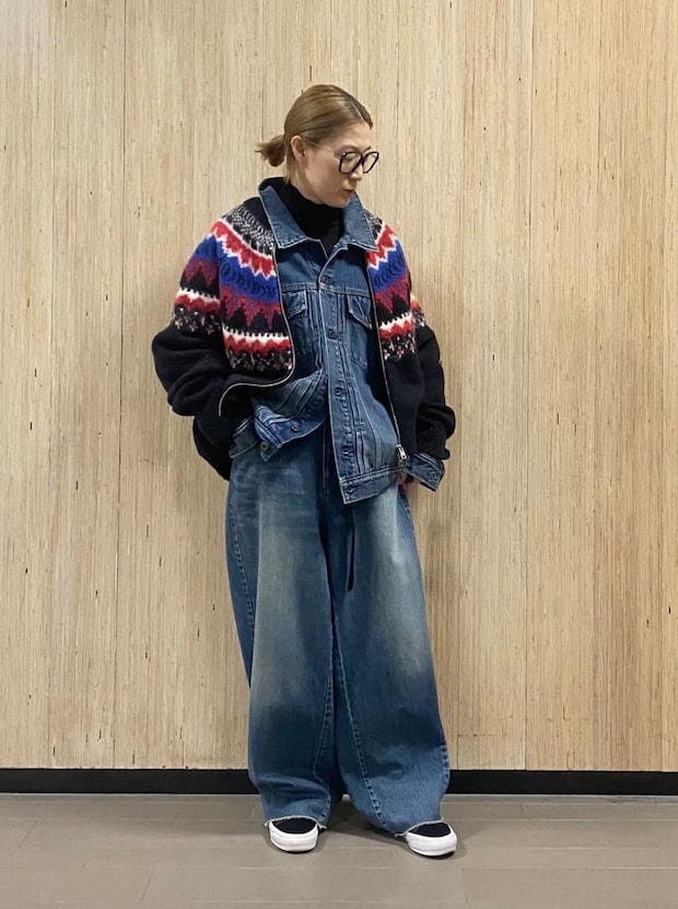 「ドイツのブランド『CLOSED』は、高品質なデニム製品を中心としたファッションブランドですが、今回はノルディック柄が可愛いカーディガンをチョイス。中に着るデニムジャケットやデニムパンツもBIGサイズを選んで、あえてルーズなスタイリングに仕上げました」
