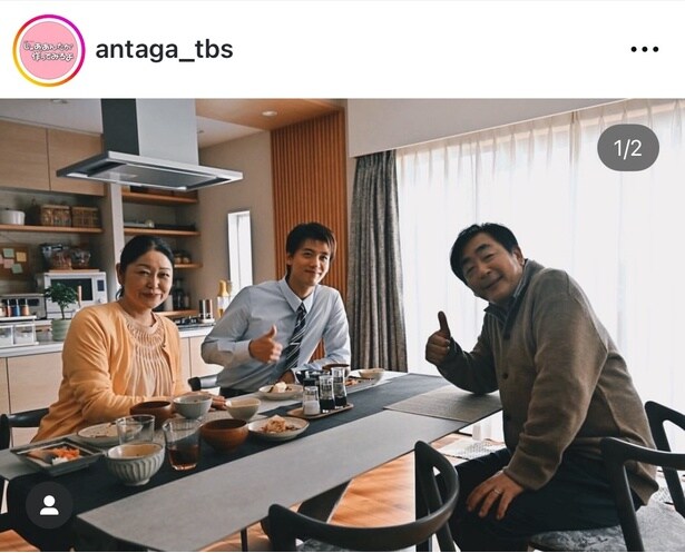 この日、公式Instagramは「海老原家仲良くね」というコメントとともに写真を投稿。笑顔でグッドポーズをする竹内涼真と菅原大吉、静かに微笑む池津祥子の親子ショットが公開された。