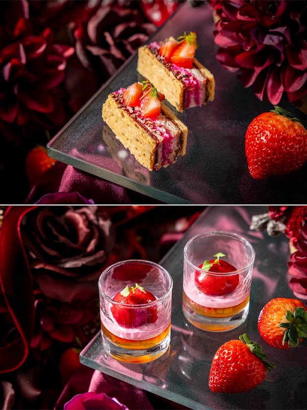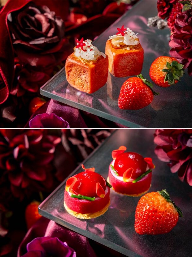 また、乾杯のシャンパーニュといちごプレートが付いた「デラックスアフタヌーンティー」も期間限定で登場。注目は、デラックスアフタヌーンティーとナイトティーにて楽しめる「帆立のムースとココナッツカレーのボンボン バラを添えて」。まろやかな帆立のムースに、ココナッツカレーを閉じ込めたゼリードームをのせ、赤かぶのピクルスで巻きあげて仕上げられた1品をぜひ味わってみて。