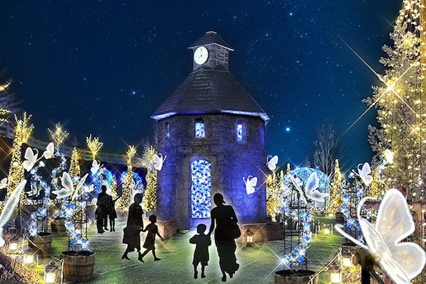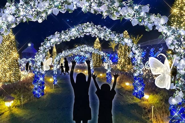 見どころのひとつ目が、シャンパンゴールドに輝く「ローズフォレスト」。青と白のバラのアーチが一際目を引き、フォトジェニックでいて幻想的な雰囲気を堪能できる。花とたわむれる蝶も美しく、ロマンティックなひとときを過ごせそう。