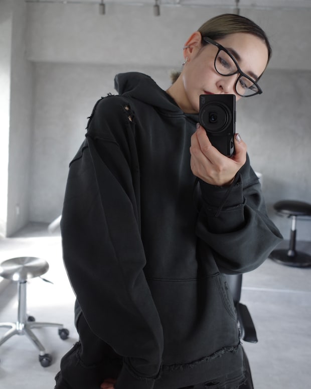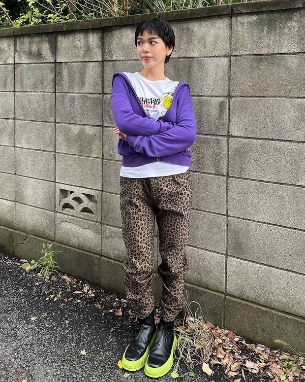 「何着あっても欲しくなるジップフーディ。パキッとしたパープルと丈感に惹かれて買いました! 短丈なのでスタイルをすっきり見せることができます。今回は豹柄のパンツと合わせてパンクっぽい雰囲気にしてみました!」