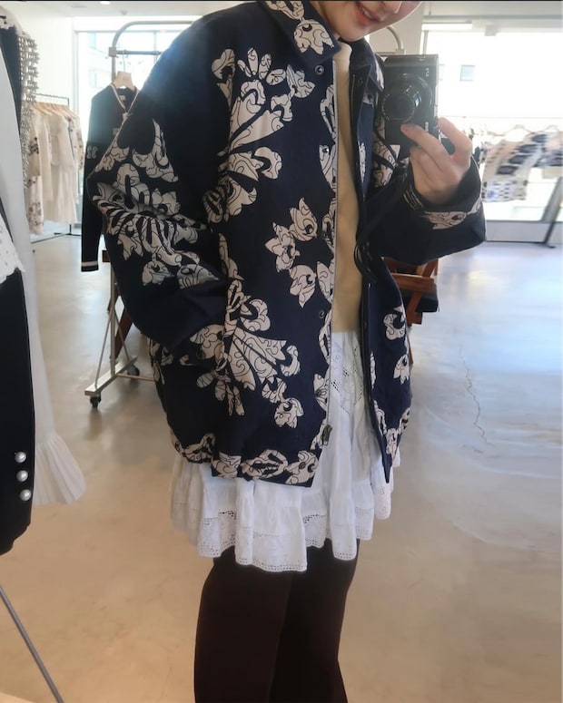 「展示会でひと目惚れしました! 暖冬かつ子どもがいると暑いので、ダウンよりも重ね着で温度調節しやすいアウターが便利です。羽織るだけで主役になる総柄が冬のコーデを引き立ててくれます!」