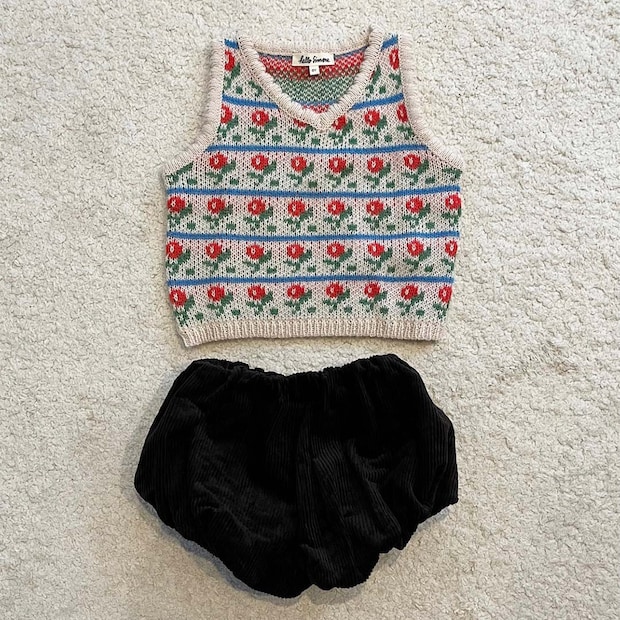 「ベストはお花の模様が『ハローシモーヌ』らしくてお気に入り。室内で過ごすときや季節の変わり目に重宝しています! ブルマはアヒルさんみたいなボリュームが可愛くて購入しました。コーディネートしやすい深いブラウンの色も素敵です!」