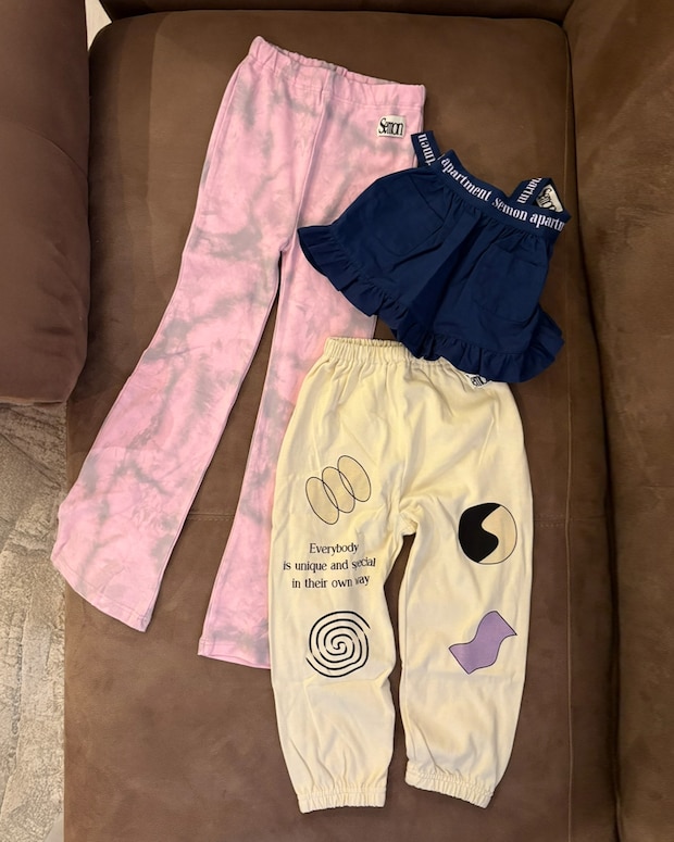 「左のフレアパンツはハイウエストとシルエット、ピンクのタイダイなど、すべてがツボでした! 動くたびにラインがきれいに出て、履くだけでおしゃれなシルエットに♡ 真ん中のプリントパンツは、綿100%の天竺編みで生地も気持ちよく、お気に入りです。シンプルなトップスに合わせるだけで雰囲気が出ます! エプロンスカートはエプロンなのにガーリーすぎず、冬のミリタリーなファッションにも合わせたらアクセントになり可愛いなと思い購入しました。重ねるだけでコーデに立体感が出て、季節を問わず楽しめそうです♪」
