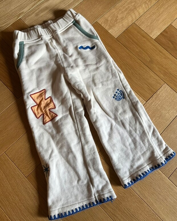 「両親ともヒッピーカルチャーや古着が好きなので、ヒッピームードのあるヴィンテージライクなテイストに惹かれて購入しました。大きめのワッペンや刺しゅうのデザインが陽気で素敵です。スウェット素材で履きやすいところも◎!」