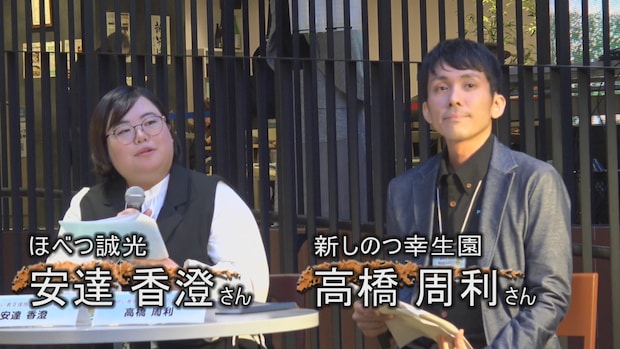 昨年のセミナーではパネリストとして参加していた司会の二人。精肉店から福祉業界に転職した新しのつ幸生園の高橋周利さんは働きながらやりがいを見つけ、今や「天職だ」と感じているという。ほべつ誠光の安達香澄さんは、福祉の仕事は思いがあれば、誰でもできてやりがいを感じられる仕事であると話していました。